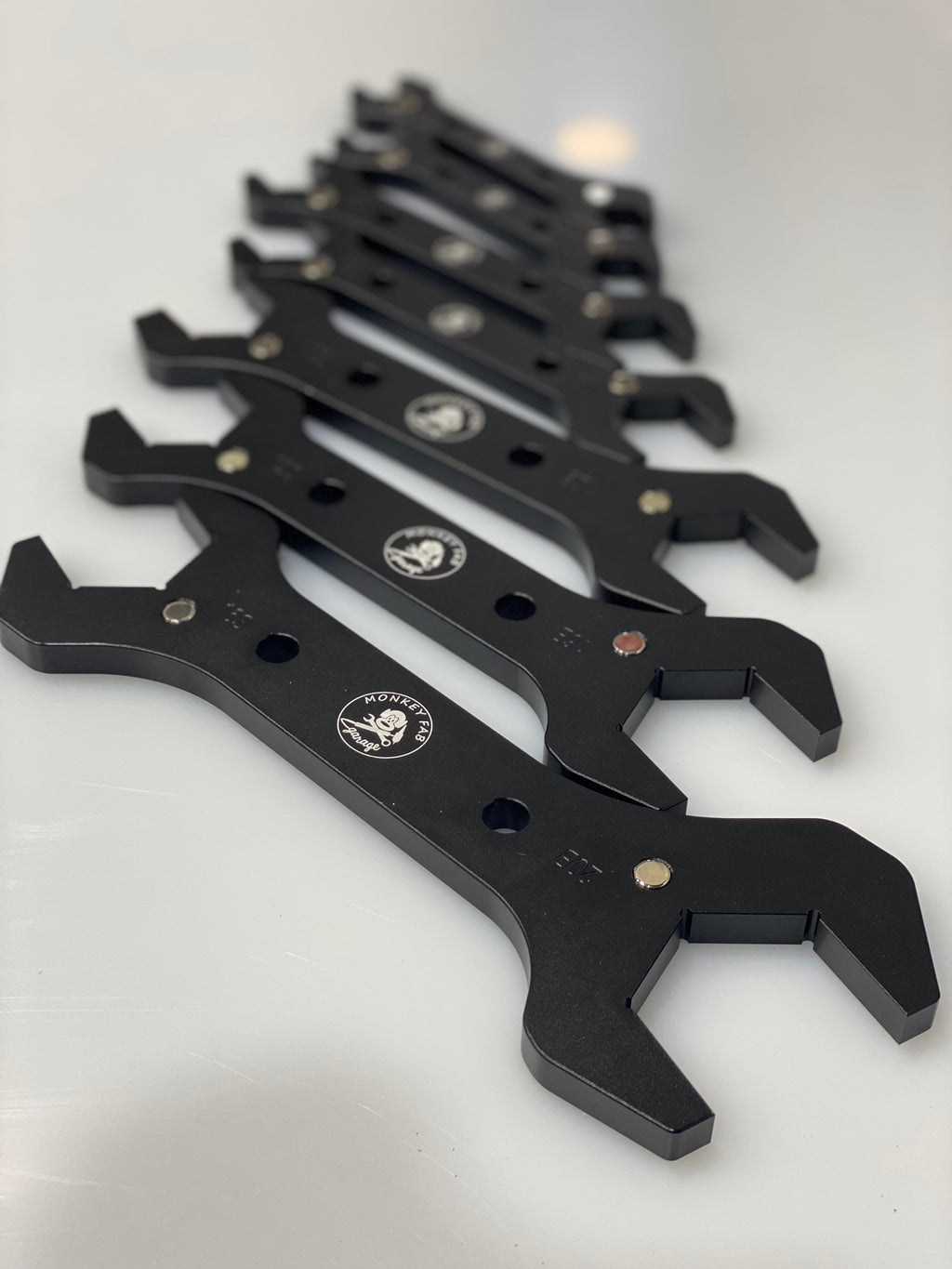 SET INCLUDES 7 BLACK ANODIZED WRENCHES WITH EMBEDDED MAGNETS SO YOU CAN STICK THEM ON YOUR TOOLBOXES, LIFTS, OR CARS AND NOT LOSE THEM.